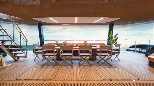 Από το πιλοτήριο, μια σκάλα οδηγεί στο επάνω κατάστρωμα που καλύπτει μια μεγάλη έκταση και περιλαμβάνει τζακούζι και άπλετο χώρο για ηλιοθεραπεία.