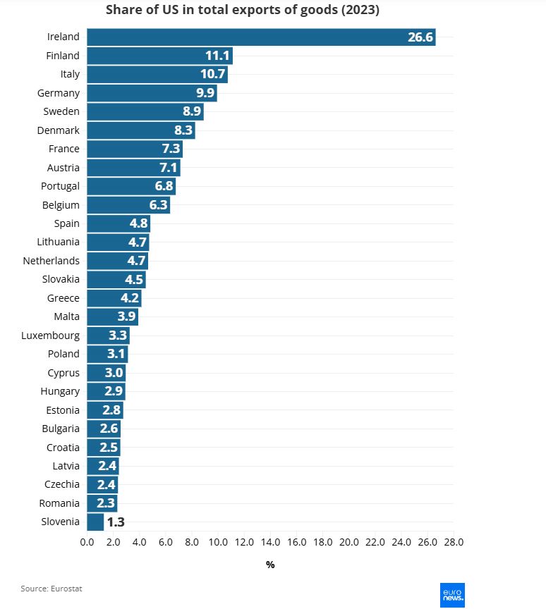 Η Ιρλανδία είναι μακράν η χώρα της ΕΕ που εξαρτάται περισσότερο από τις εξαγωγές προς τις ΗΠΑ. Το 2023, περισσότερο από το ένα τέταρτο (26,6%) του συνόλου των ιρλανδικών εξαγωγών αγαθών κατευθύνεται στις ΗΠΑ, σύμφωνα με τη Eurostat.