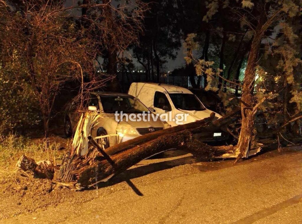 Σε τουλάχιστον δύο περιπτώσεις, στο κέντρο της πόλης αλλά και στην Τούμπα, στην οδό Κλεάνθους δέντρα έπεσαν πάνω σε οχήματα προκαλώντας φθορές.