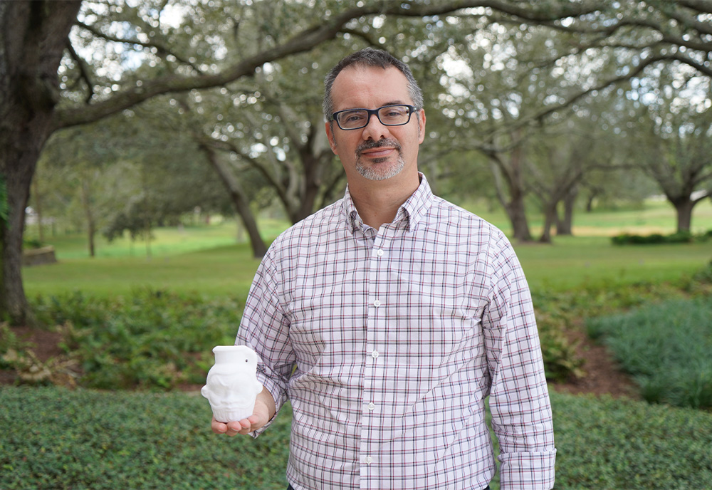 Ο επικεφαλής της μελέτης Νταβίντ Τανάσι με αντίγραφο της κούπας από τρισδιάστατο εκτυπωτή (Cassidy Delamarter)