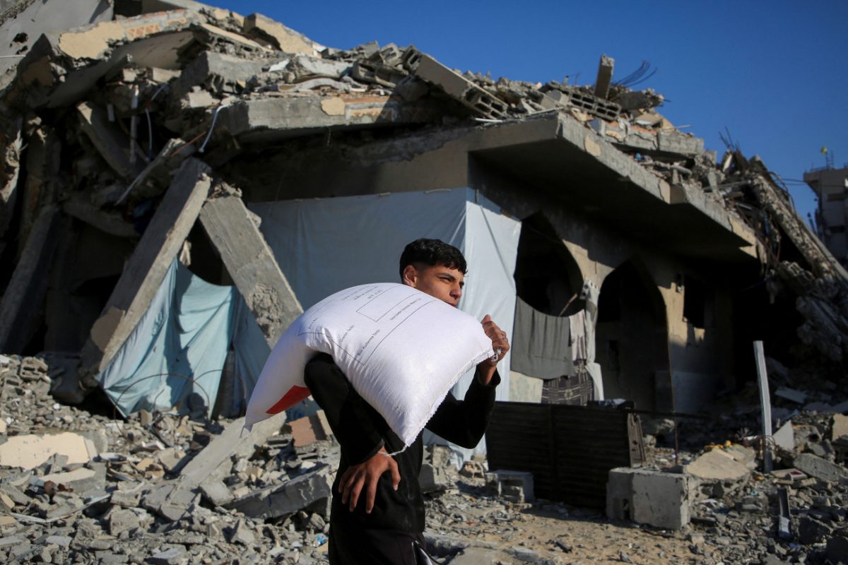 Παλαιστίνιος κρατάει σακί με αλεύρι στη Χαν Γιουνίς, στη νότια Γάζα.