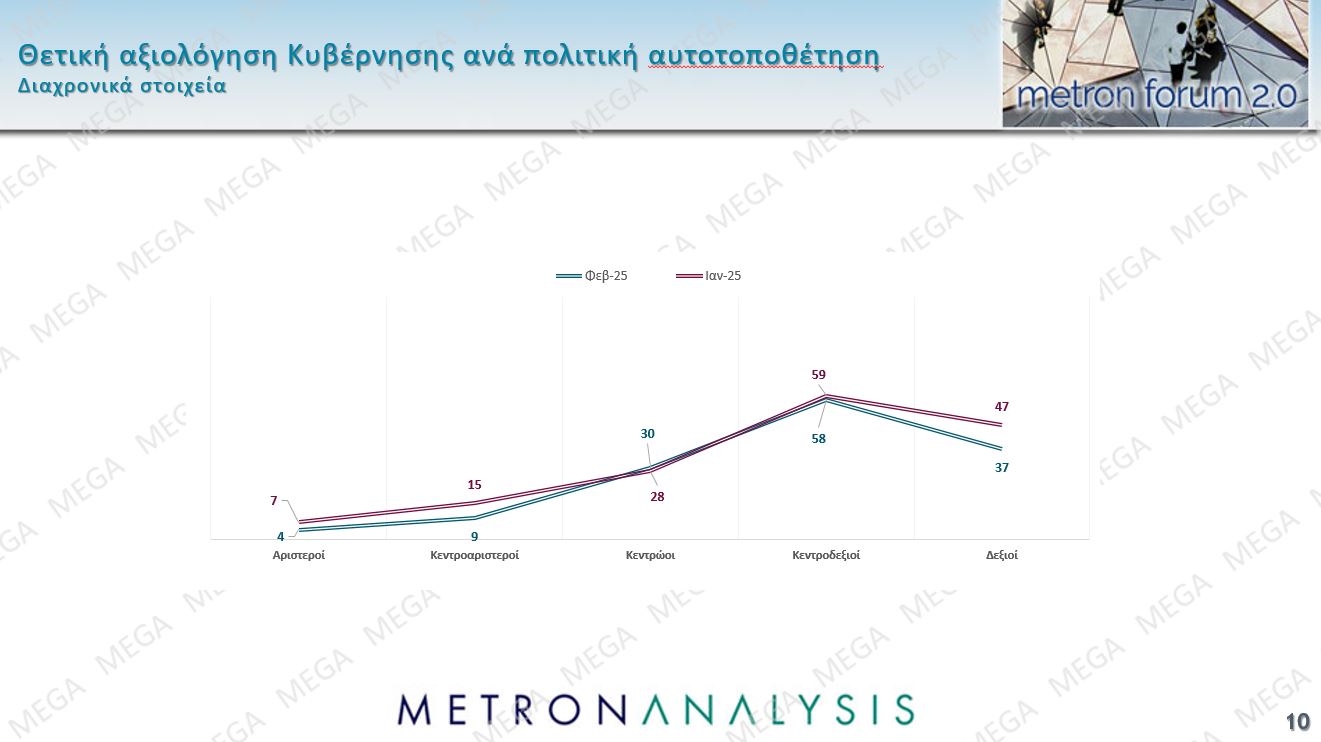 Οι αρνητικές γνώμες για την κυβέρνηση ανεβαίνουν στο 68% και οι θετικές υποχωρούν στο 24%, το χαμηλότερο σημείο των τελευταίων μηνών. Με την εξαίρεση όσων αυτοπροσδιορίζονται ως κεντρώοι και κεντροδεξιοί, σε όλους τους άλλους αυτοπροσδιορισμούς έχουμε υποχώρηση των θετικών γνωμών, με πιο χαρακτηριστικό παράδειγμα ότι οι θετικές γνώμες σε όσους αυτοπροσδιορίζονται ως δεξιοί υποχωρούν από το 47% στο 37%.