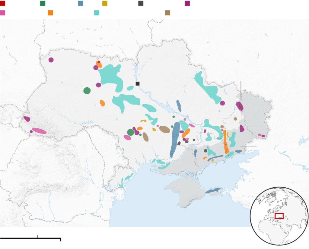 Στον ακόλουθο χάρτη της Ουκρανίας, οι σπάνιες γαίες εμφανίζονται με κόκκινο και πορτοκαλί, το ουράνιο με καφέ χρώμα, το λίθιο με κιτρινωπό, το τιτάνιο με τιρκουάζ και ο σίδηρος με μπλε.