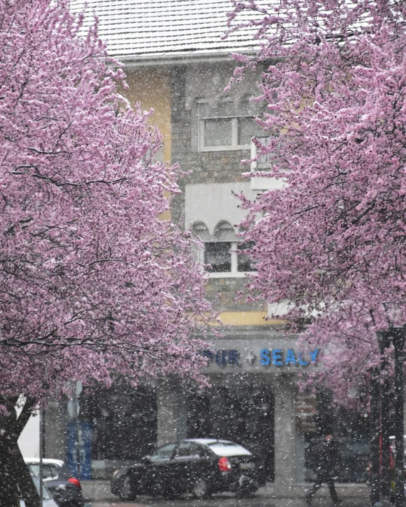 Παράλληλα καταγράφηκε μια φωτογραφία με το κοντράστ των δύο εποχών, του χειμώνα με τη χιονόπτωση και της άνοιξης με τα ανθισμένα δέντρα.