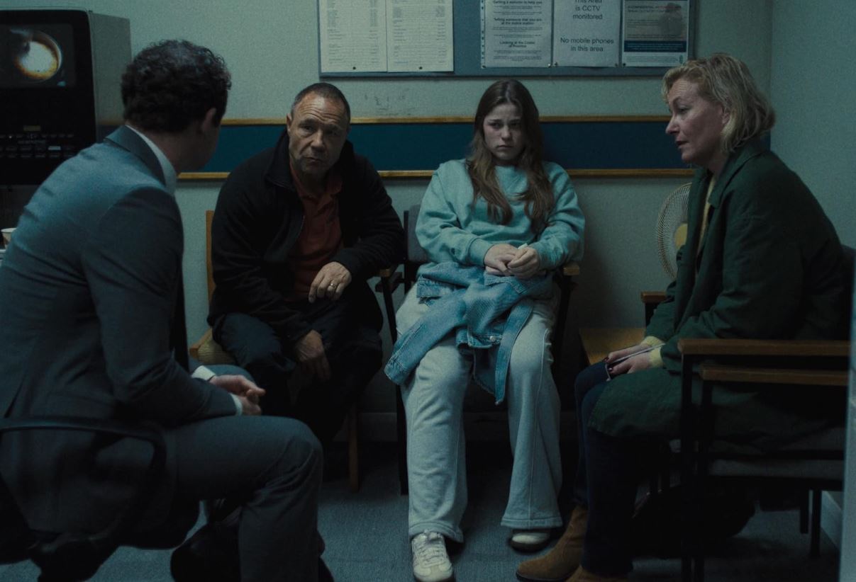 Η σκηνή που ο τηλεοπτικός πατέρας, ο γιος και ο δικηγόρος βρίσκονται σε διαδικασία ανάκρισης.