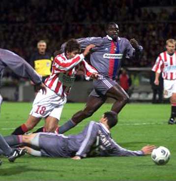 Ο Ολυμπιακός έδειξε να αιφνιδιάζεται από τους ψυχωμένους Γάλλους στην αρχή του αγώνα. Μόλις στο 2 ο Βερέλ «χόρεψε» από τα δεξιά τον Κόντη, σέντραρε πολύ καλά και στη μικρή περιοχή του Ελευθερόπουλου πετάχτηκε ο Λεγκλ και, με κοντινή κεφαλιά, έγραψε το 1-0.