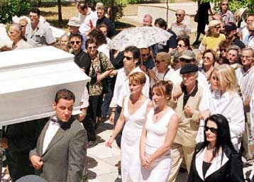 Οι τρεις γυναίκες της ζωής του Ντίνου Ηλιόπουλου, η σύζυγός του Χίλντεγκαρντ και οι δύο κόρες του, Χίλντα και Εβίτα, συντετριμμένες, ντυμένες στα λευκά, οι συνάδελφοί του της δικής του γενιάς και εκπρόσωποι της νεότερης γενιάς ηθοποιών ήταν εκεί.