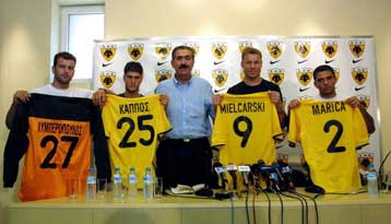 Οι άλλοι τρεις ποδοσφαιριστές είχαν ήδη ανακοινωθεί και πρόκειται για τον Πολωνό επιθετικό της Πογκόν Σέτζιν, Γκρέγκορζ Μιελκάρσκι, τον τερματοφύλακα της Καλαμάτας Σωτήρη Λυμπερόπουλο και τον επιθετικό της ίδιας ομάδας Στάθη Κάππο. Ο Μάκης Ψωμιάδης ήταν αυτός που παρουσίασε τους τέσσερις ποδοσφαιριστές και τόνισε από το βήμα της συνέντευξης Tύπου που δόθηκε στο γήπεδο της ΑΕΚ, τα εξής: