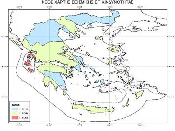 Με το νέο Χάρτη, ο ελληνικός χώρος κατανέμεται σε τρεις ζώνες σεισμικής επικινδυνότητας, με αντίστοιχες τιμές εδαφικών επιταχύνσεων σχεδιασμού, 0,16 g (βαρύτητα) για την πρώτη ζώνη, 0,24 g για την δεύτερη ζώνη και 0,36 g για την τρίτη ζώνη.