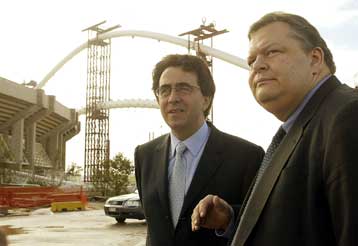 Σύσκεψη στο Ολυμπιακό Στάδιο, με θέμα την πολυσυζητημένη κατασκευή του σκέπαστρου Καλατράβα, πραγματοποιήθηκε τη Δευτέρα με τη συμμετοχή του υπουργού Πολιτισμού Ευάγγελου Βενιζέλου, της προέδρου της Οργανωτικής Επιτροπής «Αθήνα 2004» Γιάννας Αγγελοπούλου, του υφυπουργού Πολιτισμού Νάσου Αλευρά και του Ισπανού αρχιτέκτονα Σαντιάγο Καλατράβα.