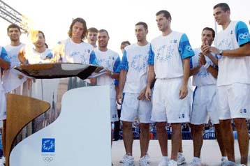 Την Ολυμπιακή Φλόγα στα μέλη της Ολυμπιακής ομάδας μπάσκετ μεταλαμπάδευσε ο βετεράνος ποδοσφαιριστής Γιώργος Κούδας, που διάνυσε μια απόσταση 300 μ. στην παραλιακή λεωφόρο Νίκης.