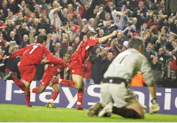 Με την πάροδο του χρόνου, ο Ολυμπιακός άρχισε να στέκεται καλύτερα, να «πατάει» πιο σίγουρα στο γήπεδο και να κρατά τους παίκτες των «κόκκινων» μακριά από την εστία του Νικοπολίδη. Μάλιστα, στο 16 το «Ανφιλντ» λίγο έλειψε να «παγώσει», όταν η γυριστή κεφαλιά του Τζέραρντ, που προσπάθησε να απομακρύνει σε φάουλ του Ριβάλντο, έστειλε τη μπάλα ελάχιστα πάνω από το οριζόντιο δοκάρι του Κέρκλαντ.
