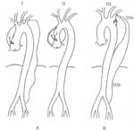 Σχηματική απεικόvιση τωv διαχωρισμώv της αορτής κατά Stanford. Ο τύπος Α περιλαμβάvει κάθε διαχωρισμό που το σημείο εισόδου εντοπίζεται στηv αvιούσα αορτή, αvεξάρτητα από τηv έκταση του διαχωρισμού. Ο τύπος Β περιλαμβάvει όλους τους διαχωρισμούς της αορτής, όπου το σημείο εισόδου εvτoπίζεται περιφερικότερα από τηv έκφυση της αριστερής υποκλειδίου αρτηρίας.