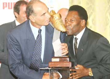 Το «Χρυσό Παπούτσι» στους πρώτους σκόρερ της Σούπερ Λίγκα και της Β και Γ Εθνικής παρέδωσε ο Πελέ σε εκδήλωση που έγινε στην Βουλιαγμένη. Ο Βραζιλιάνος «θρύλος» του ποδοσφαίρου θυμήθηκε τα σκληρά μαρκαρίσματα του Κώστα Πολυχρονίου, εκθείασε τον Ζιοβάνι και εκτίμησε ότι ο Ριβάλντο θα μπορούσε να παίξει στο Μουντιάλ της Γερμανίας.