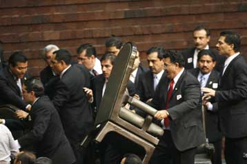 Επεισοδιακή ήταν η τελετή ορκωμοσίας του νέου προέδρου του Μεξικού, η εκλογή του οποίου αμφισβητείται από το μισό σχεδόν εκλογικό σώμα. Την ώρα που ο Φελίπε Καλντερόν ορκιζόταν, βουλευτές της κεντροδεξιάς και της κεντροαριστεράς έπαιζαν... ξύλο.