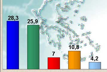 Σύμφωνα με τα ευρήματα της δημοσκόπησης της Metron Analysis, που δημοσιεύεται στο Ποντίκι, η ΝΔ προηγείται με 28,3%, έναντι 25,9% για το ΠΑΣΟΚ. Ακολουθεί το ΚΚΕ με 7%, ο ΣΥΡΙΖΑ με 10,8%, ο ΛΑΟΣ με 4,2% και οι Οικολόγοι Πράσινοι με 2,2%.