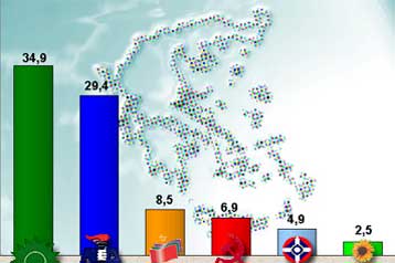 Στην πρόθεση ψήφου η ΝΔ συγκεντρώνει ποσοστό 29,4%, το ΠΑΣΟΚ 34,9%, το ΚΚΕ 6,9%, ο ΣΥΡΙΖΑ υποχωρεί τέσσερις μονάδες -σε σχέση με την προηγούμενη μέτρηση- στο 8,5%, ο ΛΑΟΣ βρίσκεται στο 4,9% και οι Οικολόγοι Πράσινοι στο 2,5%.