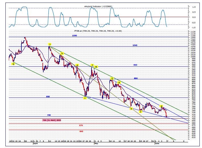 Σύμφωνα με το τμήμα αναλύσεων της εταιρείας, η έντονη αδυναμία ανοδικής διαφυγής του FTSE 20 πάνω από τη βραχυχρόνια καθοδική γραμμή αντίστασης URN, στις 752 μονάδες, επέφερε βίαιο αντιθετικό αποτέλεσμα για τον δείκτη της υψηλής κεφαλαιοποίησης οδηγώντας τον σε απόσταση αναπνοής με το ιστορικό επίπεδο στήριξης των 700 μονάδων (χαμηλά 2009 και 2003).