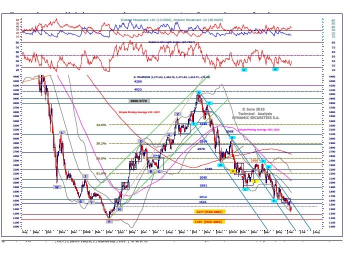 Έτσι λοιπόν, στην περίπτωση, που ο Τραπεζικός Δείκτης δηλώσει έντονη αδυναμία προσέγγισης των 1522 μονάδων θα “αφεθεί” στο καθοδικό ρέμα του πτωτικού καναλιού δίνοντας ως στόχο την περιοχή, όπου σημειώθηκαν τα χαμηλά του Μαρτίου του 2003, στις 1277 μονάδες περίπου.