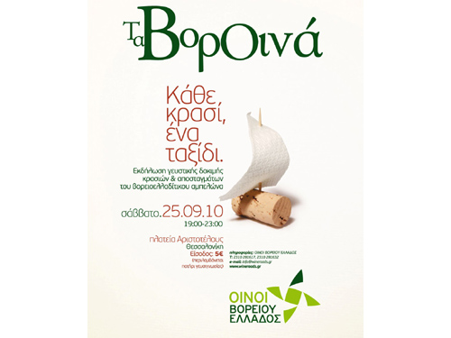 Για έβδομη χρονιά, τα μέλη της Ένωσης Οινοπαραγωγών του Αμπελώνα της Βορείου Ελλάδος (ΕΝΟΑΒΕ) πραγματοποιούν την ετήσια εορταστική τους θεσμοθετημένη εκδήλωση γνωριμίας και γευσιγνωσίας με κρασιά και αποστάγματα του βορειοελλαδικού αμπελώνα, στην πόλη της Θεσσαλονίκης: “Τα ΒορΟινά”. Η εκδήλωση πραγματοποιείται το Σάββατο 25 Σεπτεμβρίου 2010, ώρα 19:00-23:00, για δεύτερη συνεχή χρονιά στην Πλατεία Αριστοτέλους.