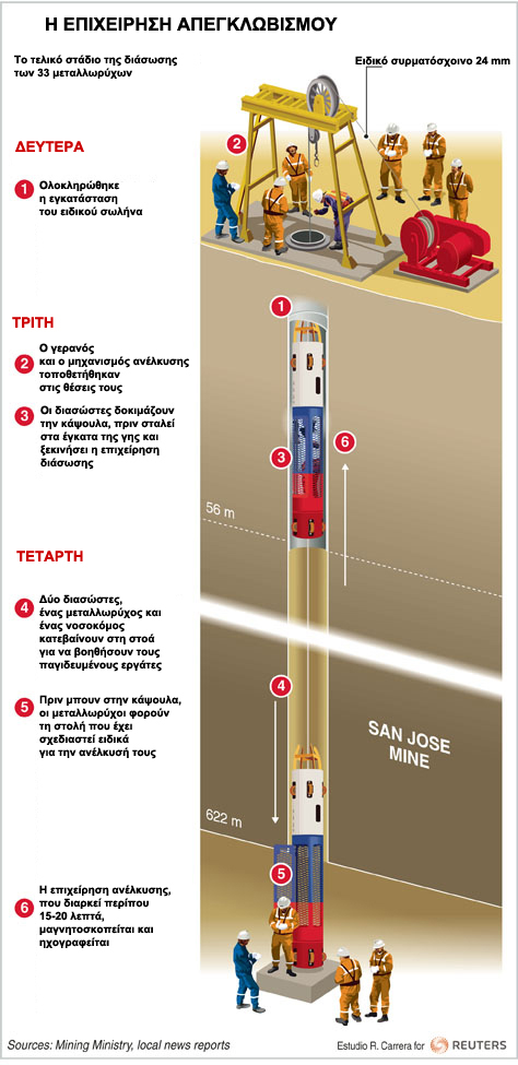 Ο ένας μετά τον άλλον οι άνδρες –γενικά σε αρκετά καλή κατάσταση σωματικής και ψυχικής υγείας– έμπαιναν στην ειδικά σχεδιασμένη κάψουλα και ανασύρονταν στην επιφάνεια. Πρώτος βγήκε ο Φλορένσιο Αβάλος, που κινηματογραφούσε τις σκηνές της ζωής των εργατών μέσα στο ορυχείο. Το πρόγραμμα ήθελε να βγαίνει τελευταίος ο Λουίς Ουρθούα, ο αρχηγός των εγκλωβισμένων εργατών που πιστώνεται με τη διατήρηση του ηθικού τους κατά τις πρώτες 17 ημέρες όταν κανένας στον (πάνω) κόσμο δεν γνώριζε αν ήταν στη ζωή. Το σημείωμα του και η διαβεβαίωση ότι και οι 33 «είμαστε καλά» ήταν αυτό που αναπτέρωσε τις ελπίδες των Χιλιανών.