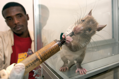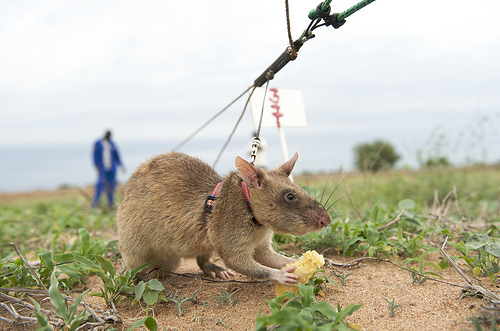 Φορώντας τα χαριτωμένα κόκκινα λουράκια τους, εκπολιτισμένοι αρουραίοι κουνούν αδιάκοπα τις μουσούδες τους καθώς μυρίζονται τις κρυμμένες νάρκες στα λιβάδια της Μοζαμβίκης και διαγιγνώσκουν τη φυματίωση στα φτωχά νοσοκομεία της χώρας.