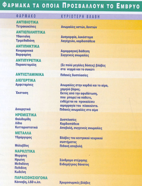Πόσο ένοχα είναι τα φάρμακαΕκείνο που πρέπει να θυμάστε είναι ότι στη διάρκεια της εγκυμοσύνης δεν πρέπει να παίρνετε κανένα -μα κανένα- φάρμακο χωρίς τη συγκατάθεση του γιατρού, έστω και αν δεν χρειάζεται συνταγή για να το προμηθευτείτε. Ακόμα και η ασπιρίνη για τον πονοκέφαλο ή το σιρόπι για το βήχα μπορεί να αποδειχθούν επικίνδυνα, γι’ αυτό μην τα πάρετε, αν δεν συμβουλευτείτε προηγουμένως το γιατρό σας.Όλα τα φάρμακα φτάνουν μέσα από το αίμα στο μωρό, επηρεάζοντας, λιγότερο ή περισσότερο, την εγκυμοσύνη σας. Βέβαια, υπάρχουν και φάρμακα, τα οποία δεν είναι επικίνδυνα για το έμβρυο και ίσως χρειαστεί να πάρετε ορισμένα. Αλλωστε, επικίνδυνο γίνεται καθετί που μπαίνει στον οργανισμό μας, όταν είναι σε μεγάλη δόση.Αυτό ισχύει ακόμα και για ένα αβλαβές κατ’ αρχάς φάρμακο, όπως είναι η ασπιρίνη. Φυσικά, η απόφαση για το ποιο από όλα επιτρέπεται (για παράδειγμα, ποιο είδος αντιβίωσης) και σε ποια δόση ανήκει αποκλειστικά στο γυναικολόγο σας.Διαφορετικά, το φάρμακο μπορεί να αποδειχθεί φαρμάκι! Οι πίνακες, τους οποίους παραθέτουμε, σας δίνουν μια μικρή ιδέα για τους κινδύνους που κρύβουν ορισμένα φάρμακα για το κύημα. Ωστόσο, δεν σημαίνει πως όσα φάρμακα δεν αναφέρονται στους παραπάνω πίνακες είναι ακίνδυνα.