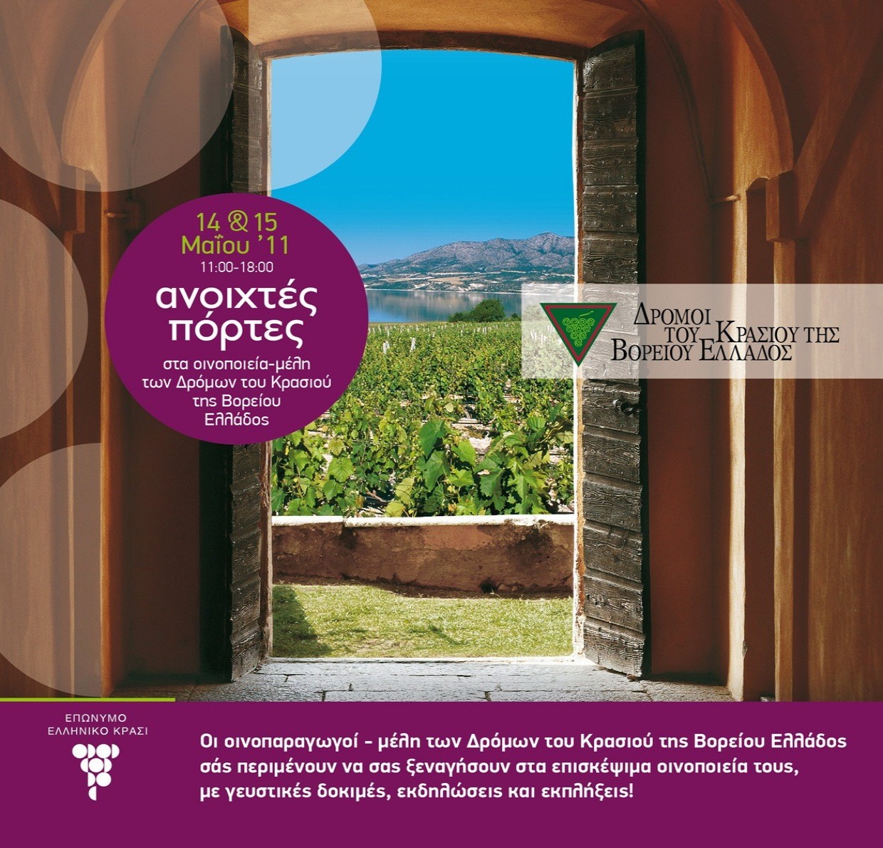 Στις 14 και 15 Μαΐου από τις 11 το πρωί μέχρι τις 6 το απόγευμα, οι οινοπαραγωγοί σας περιμένουν σε πολλά επισκέψιμα οινοποιεία της Κεντρικής και Βόρειας Ελλάδας.