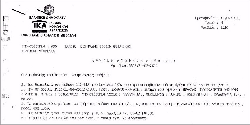 1. Τον Αύγουστο του 2010 η Διοίκηση Πρωτοδικείου της ΠΑΕ ΗΡΑΚΛΗΣ, σε συνεργασία με το Ταμείο Εσόδων του ΙΚΑ Θεσσαλονίκης, προχώρησε σε συνολική ρύθμιση, με βάση το άρθρο 44Ν 3863/10 ΑΡ.5362, του συνόλου των οφειλών, που είχε η ΠΑΕ μέχρι τον Ιούλιο του 2010 και ανέρχονταν στο συνολικό ποσό των 489.397 ευρώ.
