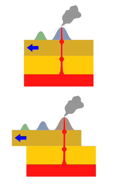 Η υποθετική στήλη κάτω από τη Χαβάη παραμένει διαρκώς στην ίδια θέση, ενώ ο φλοιός γλιστρά από πάνω της. Ως αποτέλεσμα, η στήλη σχηματίζει μια σειρά νησιών στο σύμπλεγμα της Χαβάης στην κατεύθυνση που κινείται η τεκτονική πλάκα (ένθετη αριστερά).