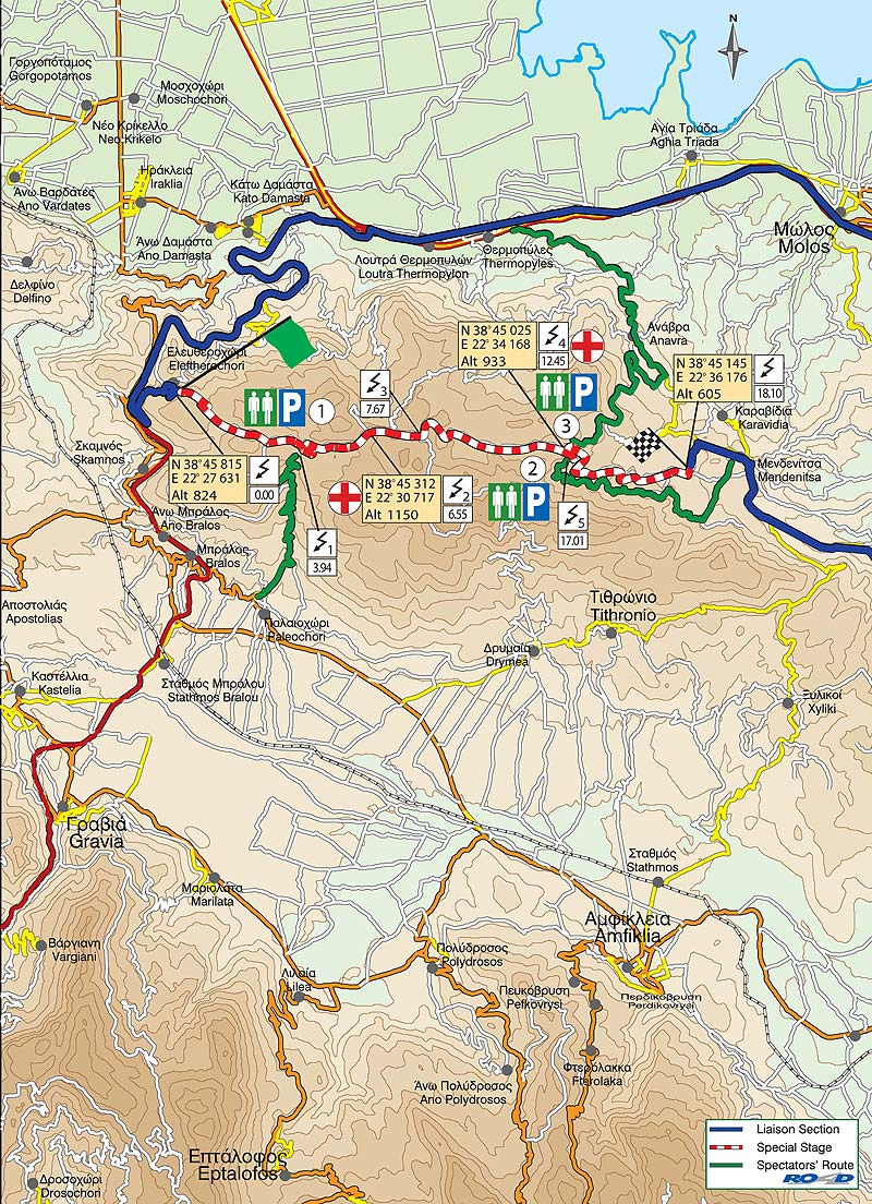 Στην παλαιά Ε.Ο. Αθηνών – Λαμίας, ερχόμενοι από Θερμοπύλες ή από Καμένα Βούρλα, στην έξοδο προς Ανάβρα, και συγκεκριμένα στην αντίστοιχη πινακίδα, μηδενίζετε το χιλιομετρητή και βγαίνετε προς Ανάβρα. Ακολουθείτε το road book και ύστερα από 14,40 χλμ. φτάνετε σε διχάλα όπου δεξιά βρίσκετε το 13 χλμ. (Α) και αριστερά το 13,18 χλμ. (Β) της Ειδικής.