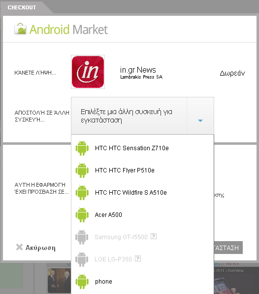 Αφού μπει από τη συσκευή στο Market (με ένα tap στο εικονίδιο στο smartphone), η συσκευή του καταχωρείται στη λίστα των συσκευών με Android στο δικτυακό τόπο του Market.