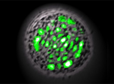 Όταν όμως το κύτταρο τοποθετηθεί ανάμεσα σε δύο κάτοπτρα, τα οποία απέχουν μόλις 20 μικρόμετρα (εκατομμυριοστά του μέτρου), τα πράσινα φωτόνια αναπηδούν πάνω τους μέχρι που συγκεντρώνονται σε μια συμφασική δέσμη, όπως συμβαίνει σε οποιοδήποτε λέιζερ.