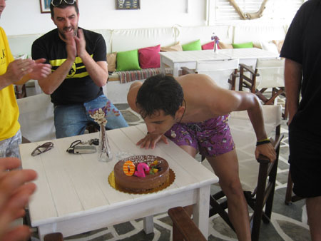 Είναι χαρακτηριστικό ότι οι συνδεσμίτες και φίλοι της Ένωσης τον περίμεναν σε ένα beach bar της Αγίας Άννας και του πρόσφεραν την τούρτα των γενεθλίων του, που έγραφε «ΧΡΟΝΙΑ ΠΟΛΛΑ ΚΩΣΤΑΡΑ… ΣΤΗΝ ΑΕΚΑΡΑ. Σ.Φ ΝΑΞΟΥ». Ο Μανωλάς έσβησε τα κεράκια και η όλη συνάντηση κύλησε σε πολύ φιλικό κλίμα.