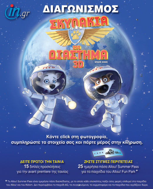 Απολαύστε σε 3D την απίστευτη περιπέτεια των πιο διάσημων σκυλο-αστροναυτών και τη δική τους εκδοχή για το πώς έφθασαν στο διάστημα! Δείτε την πρεμιέρα της ταινίας και κερδίστε ημερήσια πάσα για το Allou Fun Park!