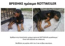 Βρέθηκε στην Κηπούπολη ημίαιμο αρσενικό ROTTWEILER μεγαλόσωμο 2 ετών, χωρίς τσιπάκι. Είναι πολύ φιλικός και υπάκουος. Είτε χάθηκε είτε διώχτηκε από το σπίτι του εν όψει καλοκαιριού. Βοηθήστε να γυρίσει σπίτι του ή και να βρει καινούριο. Επικοινωνία 6947893825, mirtov_@hotmail.com Μυρτώ Βοτανοπούλου