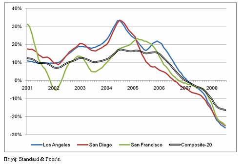Διάγραμμα 1: Ετήσια μεταβολή στις τιμές του δείκτη ακινήτων Case-Shiller στις τρεις μεγαλύτερες πόλεις της Καλιφόρνια (Los Angeles, San Diego και San Francisco) καθώς και του σύνθετου δείκτη των 20 μεγαλύτερων μητροπολιτικών περιοχών των ΗΠΑ (Composite-20).