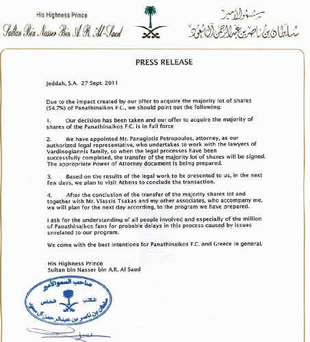 «Εξαιτίας του θορύβου που έχει δημιουργηθεί από την προσφορά μας για την απόκτηση της πλειοψηφίας των μετοχών (54,7%) του Παναθηναϊκού, θα θέλαμε να σημειώσουμε τα ακόλουθα.