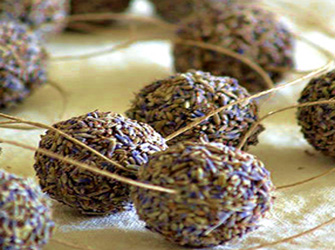Αφού αφήσετε μισή με μια ώρα τις μπάλες να στεγνώσουν βάλτε κάθε μπάλα μέσα στην παλάμη σας και πιέστε σταθερά τη λεβάντα πάνω στη κόλλα. Αυτό θα βοηθήσει στο να κολλήσουν καλύτερα τα άνθη της, εμποδίζοντας τα να διασκορπιστούν.