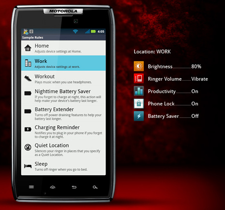 Εκτός από το Motocast, η Motorola έχει εγκαταστήσει στο Razr τις λεγόμενες Έξυπνες Ενέργειες, ή Smart Actions. Πρόκειται για μια μέθοδο παραμετροποίησης της λειτουργίας του κινητού με βάση τις συνήθειες του χρήστη. Έτσι, για παράδειγμα ο χρήστης μπορεί να επιλέξει να ενεργοποιείται αυτόματα η αναπαραγωγή λίστας τραγουδιών όταν βρίσκεται στο γυμναστήριο (με τη συνδρομή του GPS), να απενεργοποιεί την πρόκληση κίνησης data (και κατανάλωσης των διαθέσιμων MB του προγράμματος κινητής τηλεφωνίας) υπό συνθήκες (π.χ. χρονικές, το βράδυ), να περνάει σε κατάσταση εξοικονόμησης ενέργειας υπό προϋποθέσεις, να στέλνει αυτόματα SMS όταν μια κλήση μείνει αναπάντητη (ένα χαρακτηριστικό που θα υπάρχει στο Andoid 4.0) και άλλα. Μάλιστα, η εφαρμογή έρχεται φορτωμένη με διάφορα προτεινόμενα προφίλ για Έξυπνες Ενέργειες για τη χρήση στο σπίτι, στο γραφείο, στο δρόμο, όταν είναι τοποθετημένο στην υποδοχή φόρτισης κ.ά.