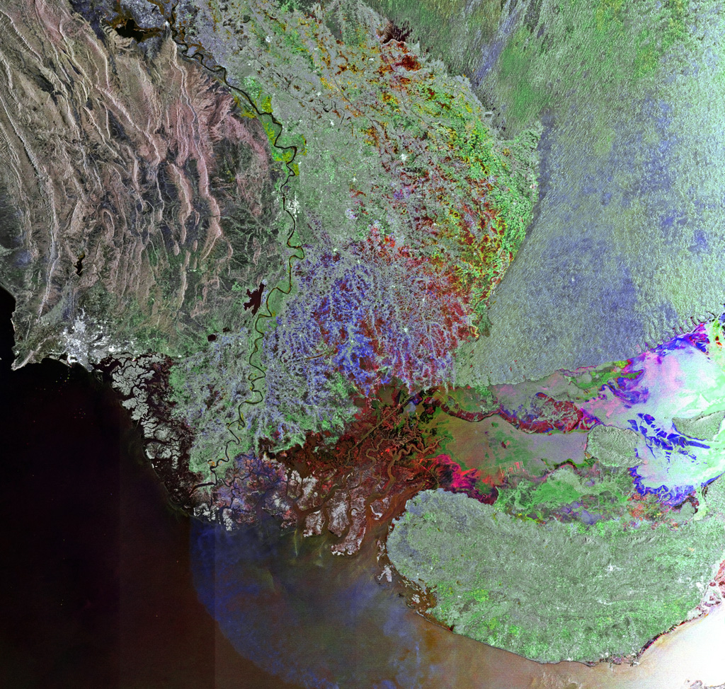 Η κοκκινωπή περιοχή που διακρίνεται λίγο δεξιά από τις εκβολές του Ινδού αντιστοιχεί σε έναν εποχικό βαλτότοπο που γεμίζει νερό και πηλό υψηλής αλατότητας την περίοδο των καλοκαιρινών μουσώνων.