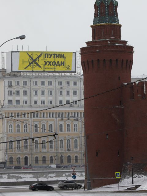 Ένα τεράστιο κιτρινόμαυρο πανό με τη φράση «Πούτιν, φύγε» και το πρόσωπό του καλυμμένο με ένα Χ ανάρτησαν αντίπαλοι του Ρώσου απέναντι από το Κρεμλίνο σε μία παράτολμη επίδειξη της άρνησής τους να τον δουν να επιστρέφει στη ρωσική προεδρία. Την ίδια στιγμή, ο ίδιος ο Πούτιν αναγνωρίζει πως μπορεί να μην έχει αρκετή υποστήριξη για να αποσπάσει τη νίκη από τον πρώτο γύρο στις κάλπες του Μαρτίου, ενώ μόνο ένας στους δύο Ρώσους θεωρεί ότι οι εκλογές θα είναι διαφανείς.