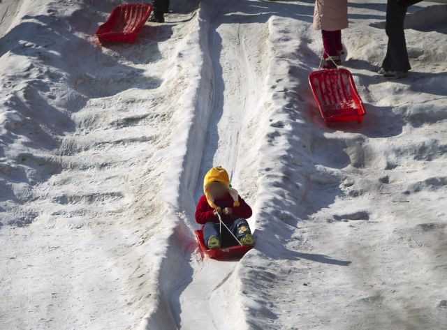 Το αγοράκι, το οποίο υποχρεώθηκε από τους γονείς του να τρέχει σε ένα γεμάτο από χιόνι πεζοδρόμιο, εμφανίζεται συχνά να κλαίει και να εκλιπαρεί τους γονείς του να το πάρουν αγκαλιά.