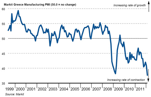 Τι εμπειρική ένδειξη έχουμε για μια τέτοια εκτίμηση; Την εξέλιξη του Purchasing Managers Index για την Ελλάδα (Φεβρουάριος 2012, Markit 1/3/2012).