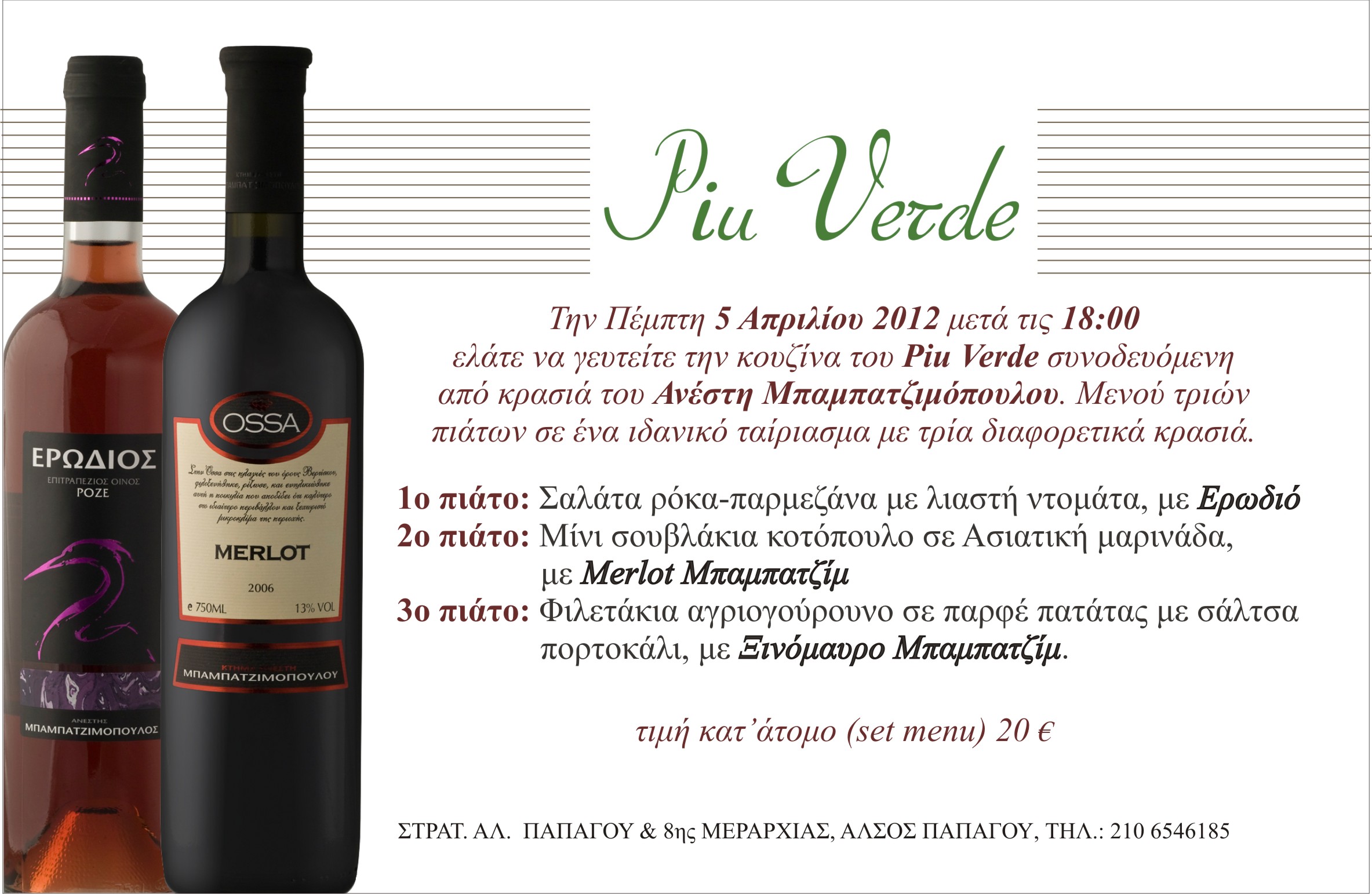 Το εστιατόριο Piu Verde (Στρατηγού Παπάγου & 8ης Μεραρχίας, τηλ.: 210-6546185), σας περιμένει, για μια ακόμα βραδιά, την Πέμπτη 5 Απριλίου 2012, μετά τις 18:00, για μιαοικονομική προσφορά γεύσεων και αρωμάτων κρασιού!