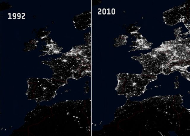 Το animation δείχνει τη μεταβολή στο φωτισμό της γηραιάς ηπείρου από το 1992 μέχρι το 2010. Οι δύο εικόνες ελήφθησαν με διαφορά 18 ετών, παρόλα αυτά είναι συγκρίσιμες, αφού προέρχονται από τον ίδιο αστερισμό δορυφόρων, το δίκτυο DMSP που προσφέρει μετεωρολογικά δεδομένα στο αμερικανικό υπουργείο Άμυνας.