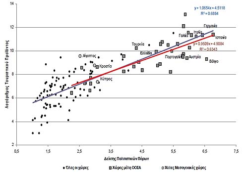 Λαμβάνοντας υπόψη την τάση που φαίνεται να διαμορφώνεταιμεταξύ των χωρών του ανεπτυγμένου κόσμου (χώρες μέλη του ΟΟΣΑ) προκύπτει πως μία βελτίωση του δείκτη της Ελλάδας που θα την έφερνε στα σημερινά επίπεδα της Πορτογαλίας (!) (αύξηση της τιμής του σχετικού δείκτη κατά 17% περίπου) θα μπορούσε να αυξήσει το τουριστικό προϊόν της Ελλάδας κατά 63%! Εντελώς αντίστοιχη εικόνα διαμορφώνεται και σε ό,τι αφορά τις αφίξεις τουριστών: Μία βελτίωση του πολιτιστικού υποβάθρου της Ελλάδας κατά 17%, θα οδηγούσε –δυνητικά– σε αύξηση των επισκεπτών στη χώρα κατά 59%.
