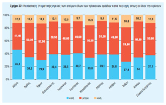 οι περιοχές με τα μεγαλύτερα ποσοστά ατόμων που κρίνουν ως «καλή» την κατάσταση της υγείας τους είναι κατά σειρά της Αθήνας (46,4%), της Καστοριάς (40,7%) και της Θεσσαλονίκης (39,4%).
