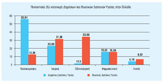 Δυστυχώς οι πολιτικές που εφαρμόζονται μέχρι σήμερα δεν συμβάλουν στην κάλυψη έστω και τμήματος των αναγκών αυτών μέσω των δημόσιων δαπανών. Οι ιδιωτικές δαπάνες είναι σχεδόν αποκλειστικά το μόνο μέσο κάλυψης των αναγκών του πληθυσμού. Σχεδόν το 50% του πληθυσμού (ασφαλισμένοι ΟΓΑ και ΟΑΕΕ) δεν έχει καμία σχεδόν κάλυψη οδοντιατρικής φροντίδας, ενώ το υπόλοιπο 50% (κυρίως ασφαλισμένοι του ΙΚΑ) έχουν περιορισμένη κάλυψη και πρόσβαση σε χαμηλής ποιότητας υπηρεσίες. Αυτό αποτυπώνεται πολύ καθαρά στο διάγραμμα που ακολουθεί, από το οποίο προκύπτει ότι μόλις το 1,23% των δημοσίων δαπανών υγείας διατίθεται για οδοντιατρική φροντίδα στην Ελλάδα όταν στις άλλες Ευρωπαϊκές χώρες το ποσοστό αυτό κυμαίνεται από 5 έως 10%. Σαν αποτέλεσμα της ελλιπούς χρηματοδότησης το κάθε νοικοκυριό καλείται να επιβαρυνθεί το κόστος με αποτέλεσμα το 33,98% των χρημάτων που πληρώνει από τις δαπάνες του για την Υγεία να αφορούν την οδοντιατρική φροντίδα.