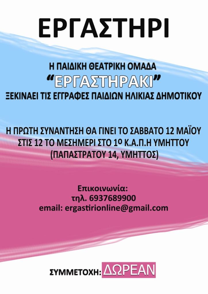 Το «Εργαστηράκι» λοιπόν ξεκινά εγγραφές παιδιών ηλικίας Δημοτικού. Η πρώτη συνάντηση θα γίνει το Σάββατο 12 Μαϊου στις 12 το μεσημέρι στο Α΄ ΚΑΠΗ Υμηττού οδός Παπαστράτου 14 (Πλατεία Υμηττού). Επικοινωνία: 6937689900 e-mail: ergastirionline@gmail.com